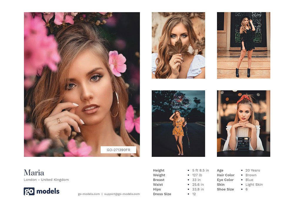 A comp card is usually created in an A5 format and contains your personal data such as name, measurements (height, chest, waist, hip), shoe size, dress size, hair color and eye color. Your comp card will also include 5 varied photos of you.